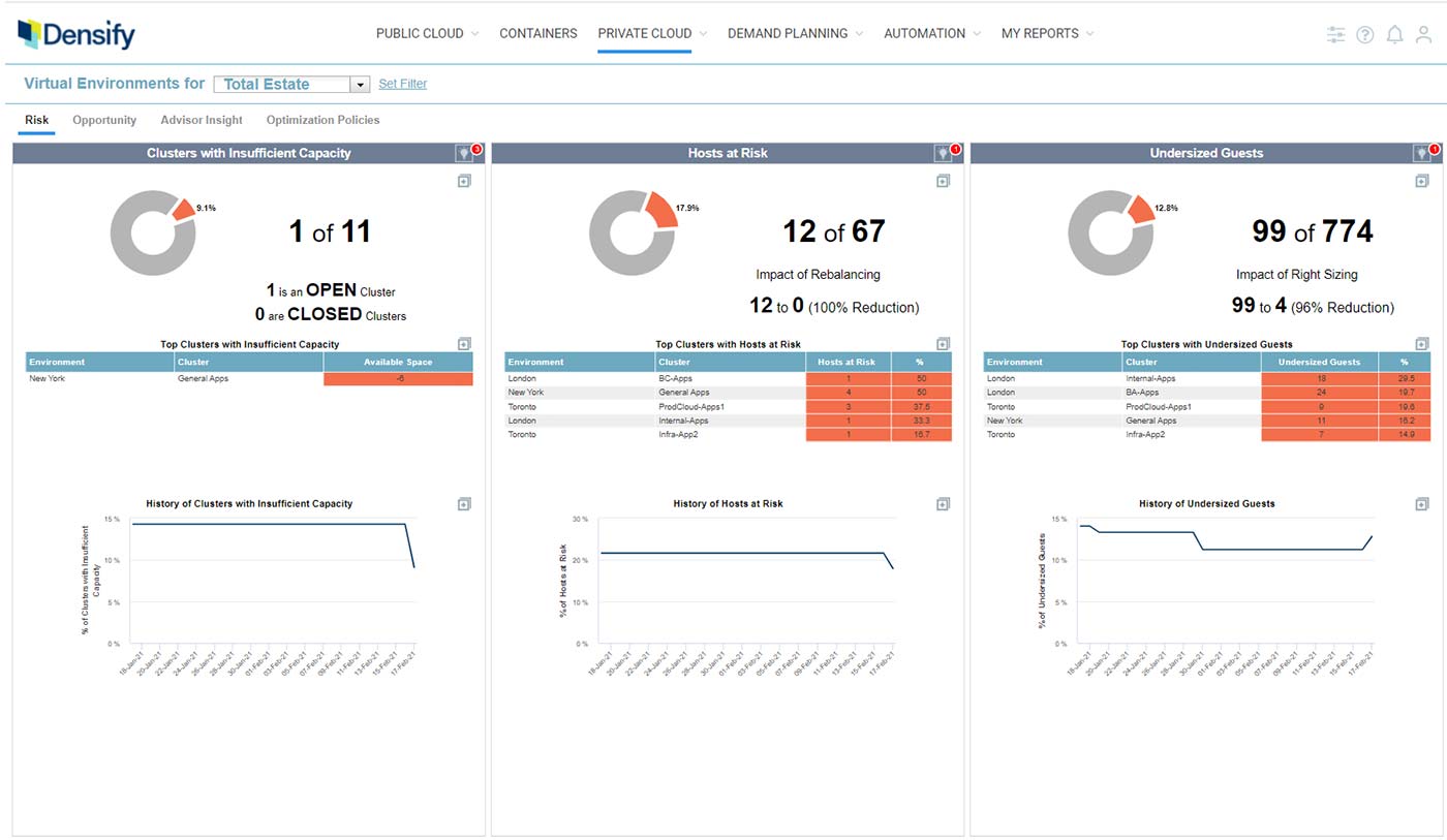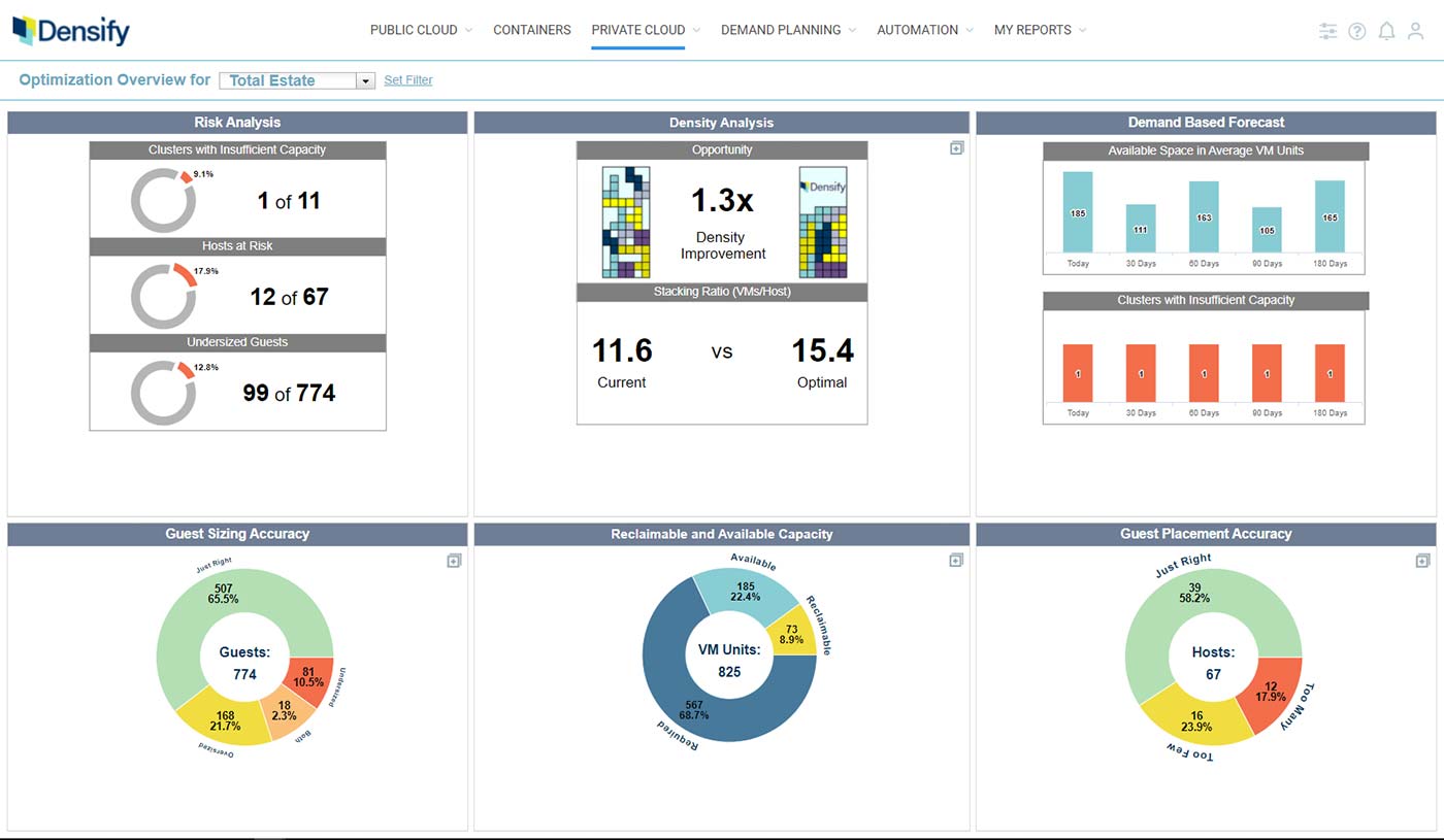 Most organizations combat risk in virtualized infrastructure by significantly over-provisioning hardware. But this inefficiency can be avoided by optimizing workload placements and rightsizing VM allocations to simultaneously reduce both risk and capacity waste. Densify leverages machine-learning-based technology to optimize your virtual infrastructure, enabling you to operate with reduced costs, less infrastructure, and better performing applications.