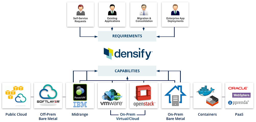 Densify automatically determines the best hosting venue for workloads across your hybrid infrastructure, whether that’s VMware-based or not. It assesses on-prem and off-prem options simultaneously to find the best fit, based on detailed utilization analysis, business requirements, technical requirements, cloud catalogs, capabilities, performance benchmarks, and more.